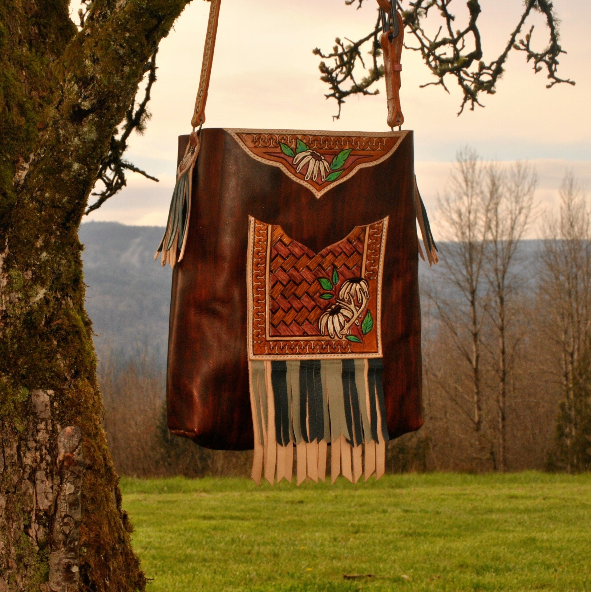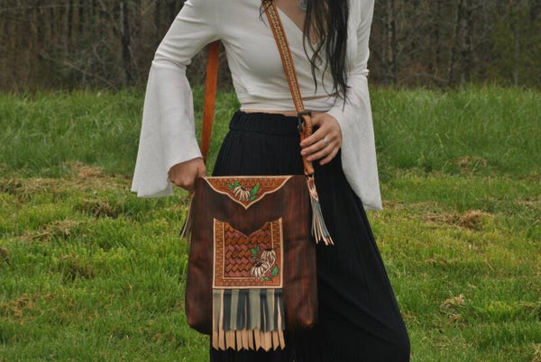 Made for the wild things, this tote bag proudly sports a functional hand tooled pocket on the front panel. The hand tooled cross body strap is adjustable with a stylish belt style buckle. With hand cut fringe and completly hand sewn, this purse is made with love and attention to detail. Built to last and comfortable to wear, this purse is made for the wild things 🖤